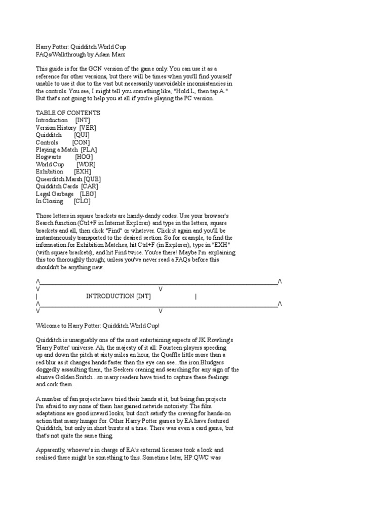 Harry Potter Quidditch World Cup Pc Controls